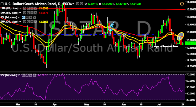 We prefer to take short position in USD/ZAR around 12.96, stop loss 13.06 and target of 12.70.