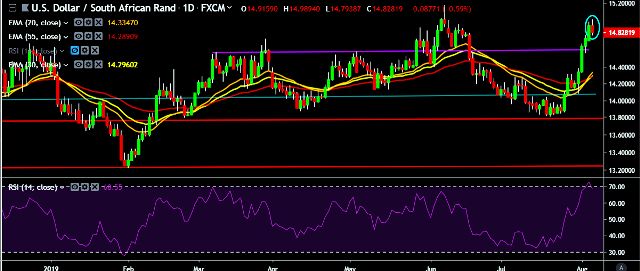 We prefer to take short position on USD/ZAR only below 14.72, stop loss at 14.98 and target of 14.57/14.27.