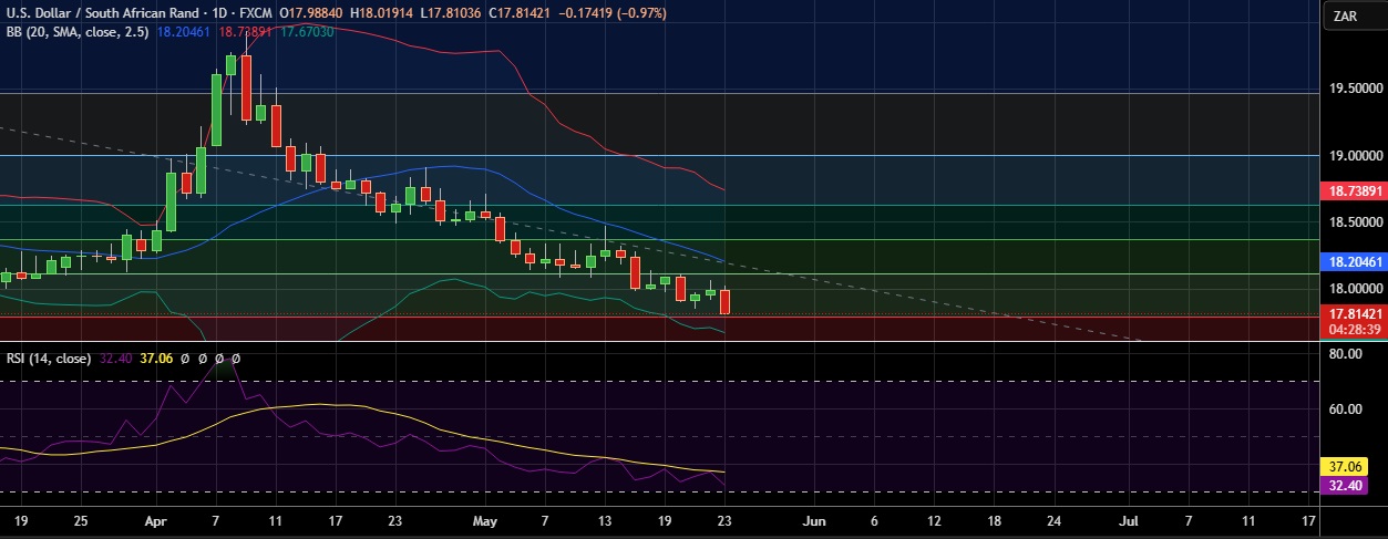 • Strong support is seen at 17.798 (23.6%fib) and break below could take the pair towards 17.690 (Lower BB).
