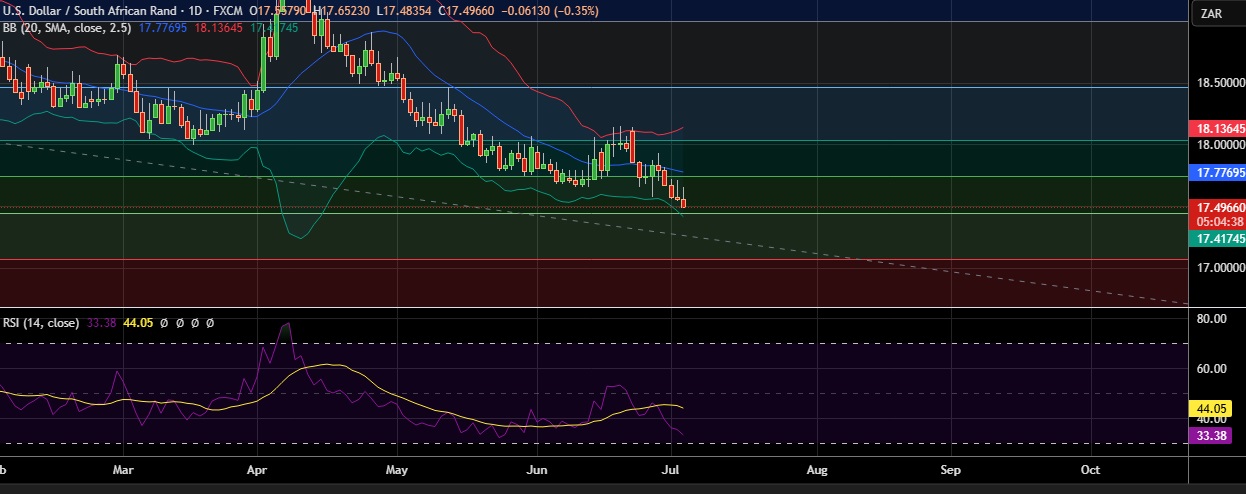 • USD/ZAR slipped lower on Thursday as upbeat U.S. employment figures and a newly signed U.S.-Vietnam trade deal lifted investor appetite for emerging market currencies.