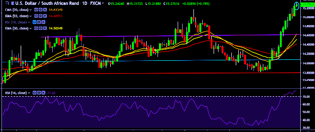 We prefer to take long position on USD/ZAR around 15.25, stop loss at 15.02 and target of 15.48/15.87.