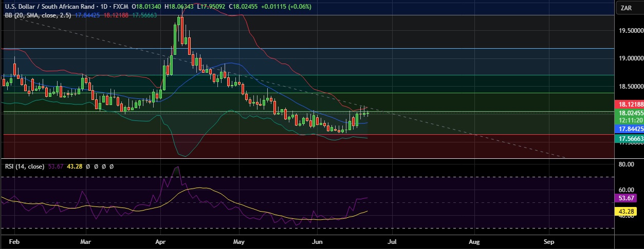 • Immediate resistance is located at 18.042(38.2%fib), any close above will push the pair towards 18.125(Higher BB).