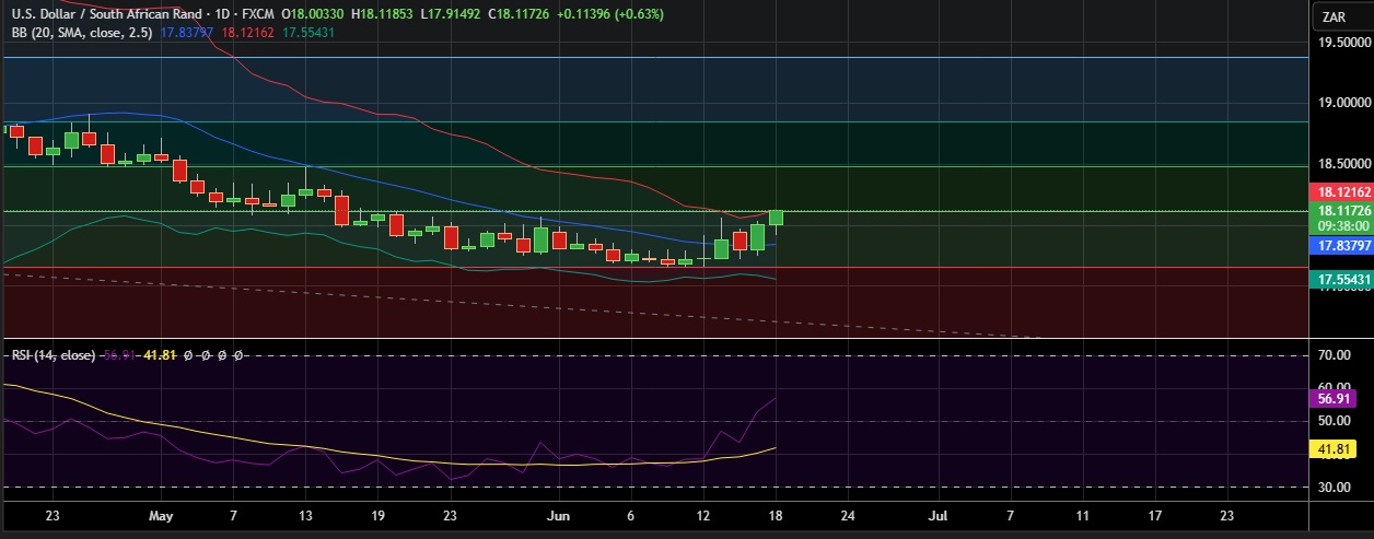 • At GMT 11:20, the dollar was trading up 0.57% at 18.117 against South African rand.