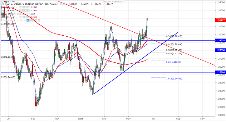 - USD/CAD is trading higher yesterday and hits one year high on account of rising trade war tension and weak Canada manufacuring sales . Canada’s manufacturing sales declined unexpectedly in Apr. It has dipped by 1.3% for the month of Apr compared to forecast of 0.6% rise. The weak Canadian data is blow for BOC and it will prevent central bank to hold interest rates. Trade war fears and death of NAFTA are the main issues dragging Canadian dollar. The pair hits high of 1.32050 yesterday and is currently trading around 1.31770.