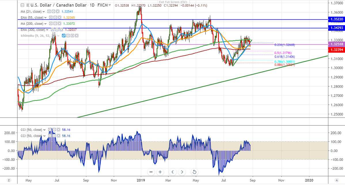 USDCAD is trading lower for 4th consecutive days and lost more than 120 pips from the high on better than Canadian economic data and a slight jump in oil price. The slight ease in a trade war is also supporting the Canadian dollar as economic slowdown will affect major commodities like oil. The pair hits low of 1.32254 and is currently trading around 1.32287.