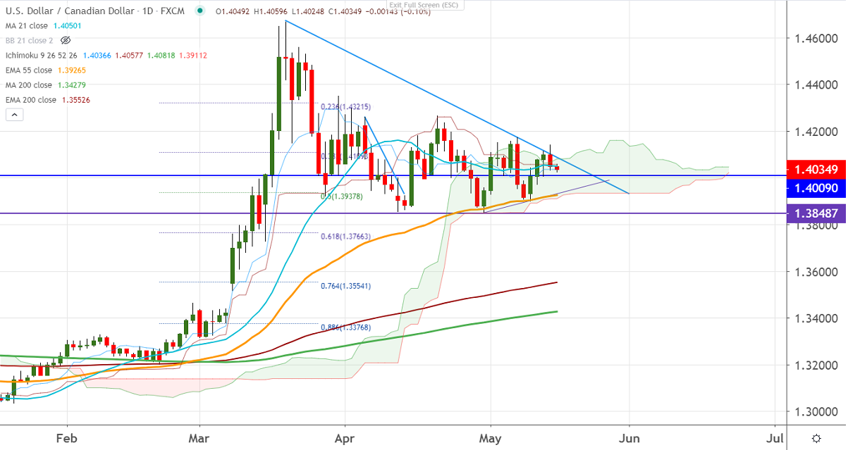 USDCAD has lost more than 100 pips from a high of 1.4140 made yesterday. The decline was mainly due to strong crude oil prices. Oil rose more than 10% as countries relaxed lockdown and demand are expected to pick up in the coming months. WTI crude holding above $28 and a jump till $30 likely.
