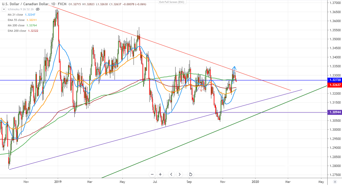 USDCAD has halted its 4- week of winning streak and shown a minor decline. The pair was one of the best performers this month and jumped more than 250 pips on a weak Canadian dollar. The weaker than expected manufacturing sales and worst jobs data was dragging the Canadian dollar down. The comments from the BOC governor show that downside risk for the growth is high due to trade uncertainty and the chance of rate cut is high in the coming months. The pair hits a low of 1.32630 at the time of writing and is currently trading around 1.32709.