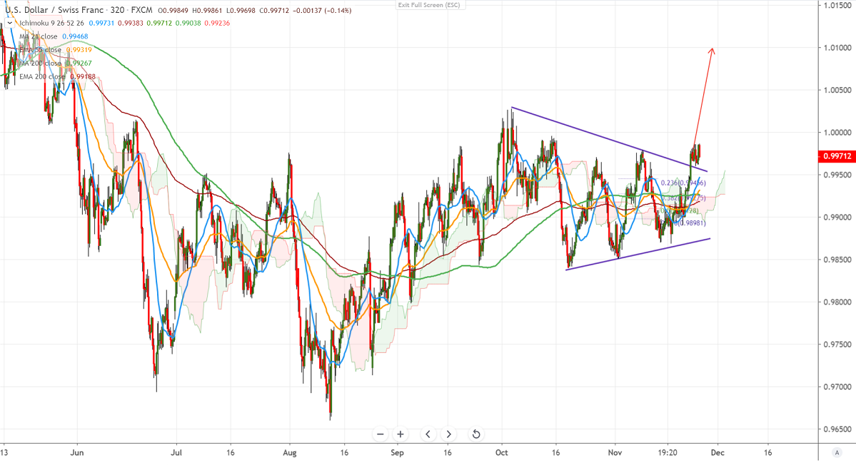 USDCHF is consolidating after hitting a high of 0.99854 yesterday. The pair bias is on the higher side for the past 1-week on easing US-China trade tension. The trade deal optimism has decreased demand for Safe-haven assets like yen, gold, etc. DXY also holding well past 98 levels and any violation above 98.45 confirms bullish continuation. The pair hits a high of 0.99861 at the time of writing and is currently trading around 0.99736.