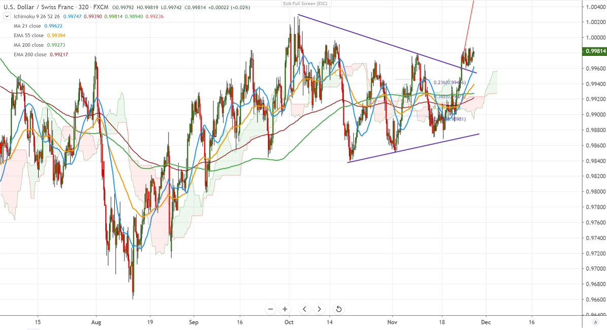 USDCHF hits a high of 0.99874 at the time of writing and is currently trading around 0.99801.