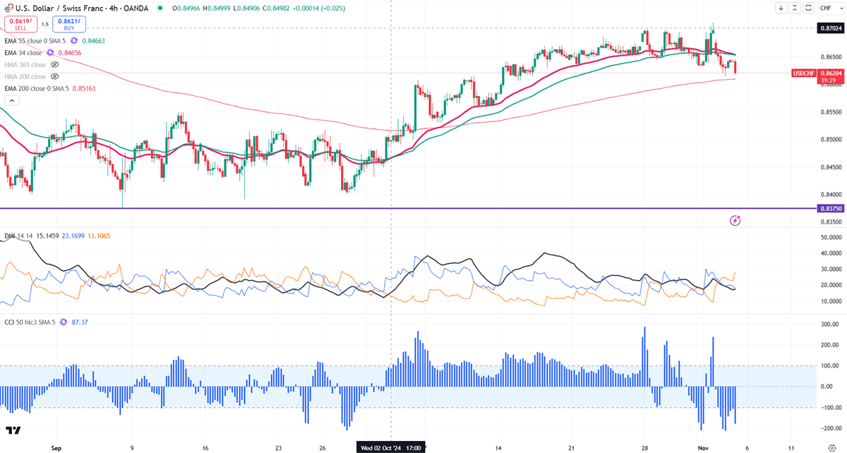 Overall sentiment for USDCHF remains bearish as long as the resistance at 0.8750 holds. Currently, the pair is trading around 0.86208, having reached a high of 0.87116. Market participants are watching the upcoming U.S. presidential elections for direction, while the policy divergence between the U.S. Federal Reserve and the Swiss National Bank (SNB) supports prices at lower levels.