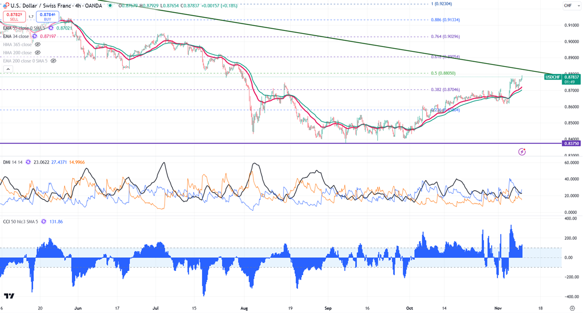 The pair is currently trading above the 34- and 55-EMA on the 4-hour chart.