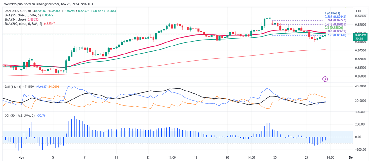 The pair is currently trading below the 34- and above 55-EMA on the 4-hour chart.