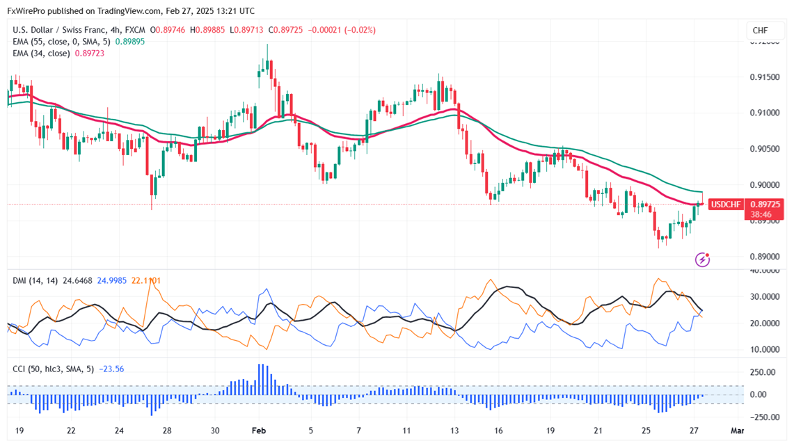 The pair is trading above the 34-EMA and below the 55-EMA on the 4-hour chart indicating a mixed trend. The immediate resistance is at 0.9000 any break above targets 0.9035/0.9070/0.9100/0.9150/0.9200/0.92250/0.9275/0.9030.