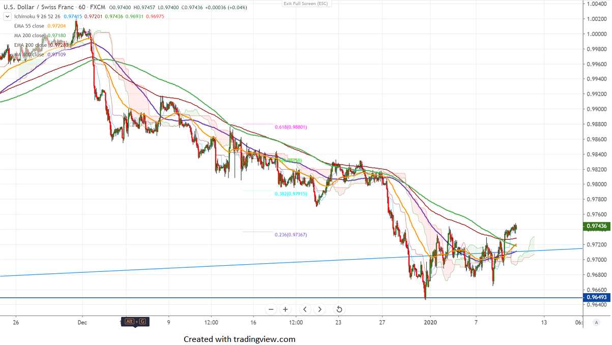 USDCHF trading higher after forming a low of 0.96650 yesterday and hits high 0.94650. The slight jump was mainly due to easing geopolitical risk has decreased demand for Safe-haven assets like yen, Swiss Franc. It is currently trading around 0.97397.