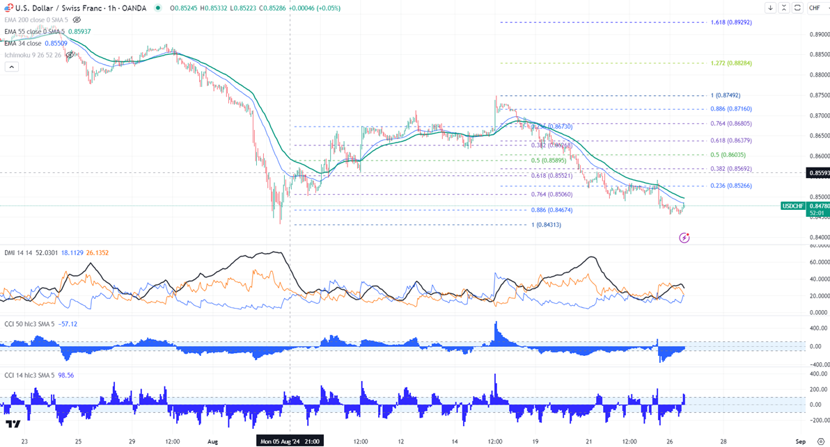 USDCHF showed a minor pullback due to short covering.It hit a high of 0.8485 and is currently trading around 0.84744