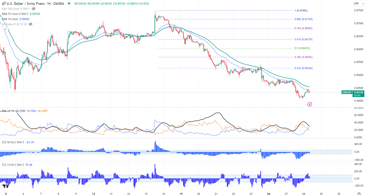 USDCHF breaks below the significant support of 0.84323 confirming the continuation of a bearish trend. It hit a low of 0.84092 and is currently trading around 0.84355.