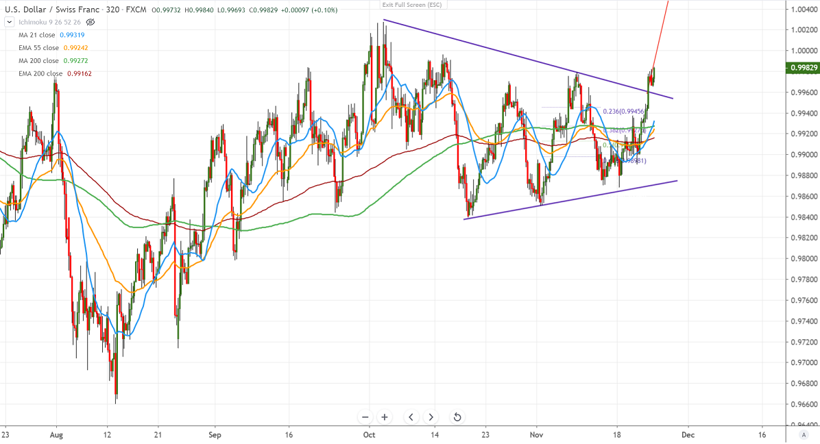 USDCHF trades higher for 5th consecutive days and jumped more than 100 pips on broad-based dollar buying and easing US-China trade tension. The renewed hopes of the trade deal have decreased demand for Safe-haven assets like yen, gold, etc. The pair hits an intraday high of 0.99830 and is currently trading around 0.99826.
