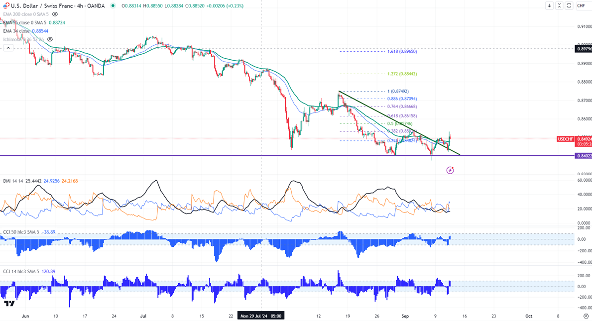 The pair is trading above 34 and below 55 EMA in the 4-hour chart.