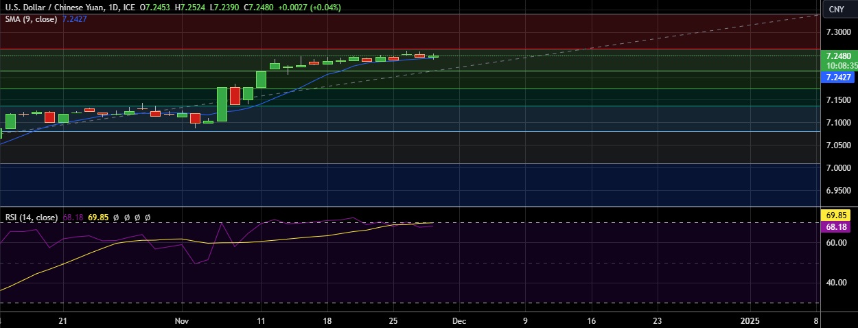 • USD/CNY steadied on Thursday as the yuan was weighed down by a stronger dollar and concerns over U.S. President-elect Donald Trump's tariff plan.
