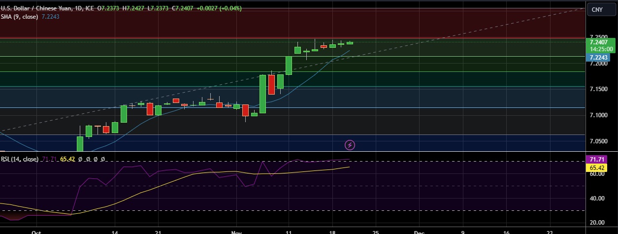 • Support is seen at 7.224(SMA 9) and break below could take the pair towards 7.214 (38.2%fib).