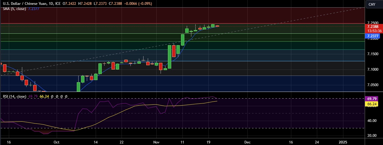• Immediate resistance is located at 7.248(23.6%fib), any close above will push the pair towards 7.266(Nov 14th high)