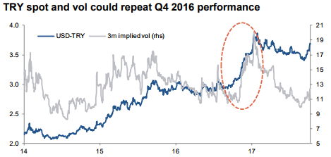 This lends itself to owning volatility, and given the difficulty in ascertaining the probabilities of a “spike followed by a recovery” versus a “trend” move higher in USDTRY, we prefer a one-touch structure over a European digital. Hence, buying USDTRY 3m one-touch knock-in 4.35 has been advocated.