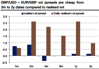 Risk profile: A durable surge in EUR crosses vols, a spread of volatility swaps is exposed to the volatility differential between two currency pairs. Investors holding the position until the 6m expiry face unlimited losses if the realized volatility between GBPUSD and EURGBP goes below 0.3 vols.