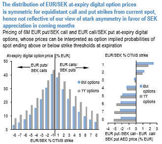 We favor buying zero-cost combinations of long EUR put/SEK call vs. short EUR call/SEK put digitals to position for an eventual normalization of Riksbank policy; for instance, off spot ref. 9.5275, 6M 9.20 EUR put/SEK call vs. 9.80 EUR call/SEK put at-expiry digital risk-reversal has a net premium credit of 2.7% EUR (-5.2 /2.7 two-way indicative. assuming equal EUR notionals/leg). The short strike is above the YTD high, hence reasonable cushion against a backup in spot. Courtesy: JPM