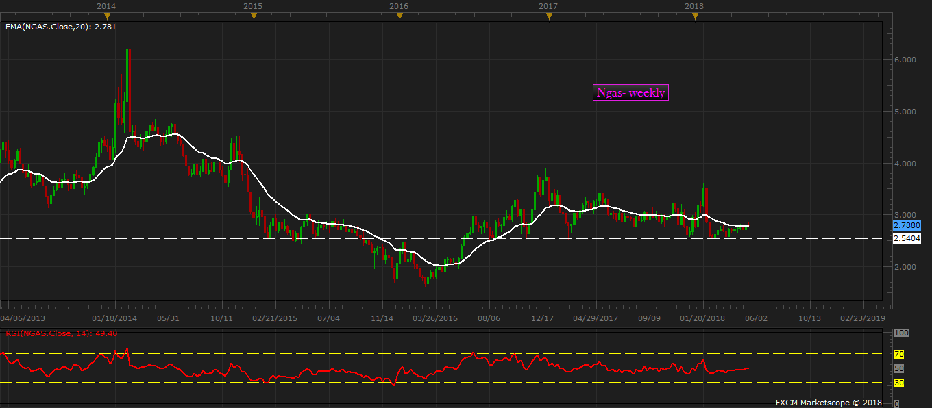 After finding support around $2.5 per MMBtu area twice since February, the price of natural gas has been creeping higher. It is currently trading at 2.78 per MMBtu. The $2.5 per MMBtu area has provided support to the natural gas price six times so far since 2016