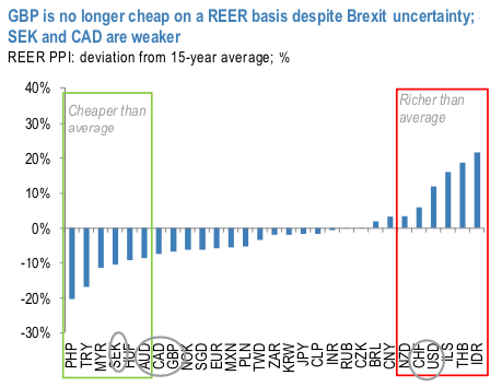 As a result, GBP valuations are not cheap any longer, having strengthened by 3% in TWI terms since mid-August—on a REER basis, SEK and CAD screen cheaper than GBP (refer above chart).
