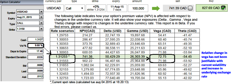 We think shift in vega has npot been justifiable with corresponding increase in exchange rate while volatility is perceived at 9.68% which is on higher side. Shift in Vega on Long ATM call was from 72.75 to 71.98.