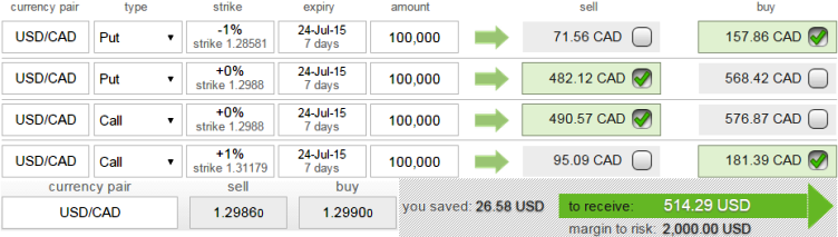 Iron Butterfly (USD/CAD) = Long OTM -0.16 delta Put (strike at 1.2863) & Short ATM Put (1.2505) + Short ATM Call (1.2505) & Long OTM 0.19 delta call (strike at 1.3124)