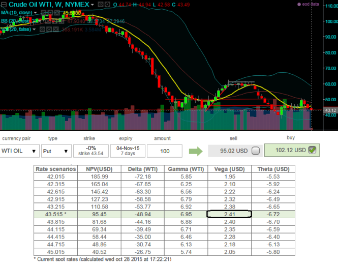 Let's suppose, as shown in the diagram, we have vega of at the money WTI put option at 2.41 with implied volatility at 20% which is now trading at US$102.02.