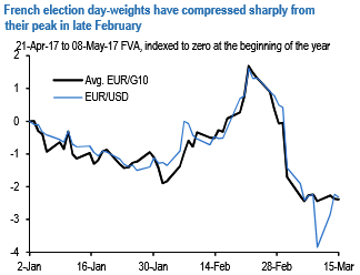In addition to a more sanguine Fed outlook, a second factor that has weighed on vols recently is that day-weights for French elections have compressed sharply over the three weeks. EUR/G10 forward vols spanning both rounds of the election have fallen 3.8 % pts. on average (refer above chart), with the biggest declines concentrated in the most event sensitive pairs such as EURCHF and EURJPY (refer above chart).