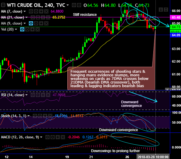 Spot out WTI CFDs frequent occurrences of shooting stars and hanging man patterns at peaks of recent rallies (refer circular areas on the daily chart). Subsequently, these bearish patterns evidence slumps, more weakness seem to be on cards as 7DMA crosses below 21DMA (which is bearish DMA crossover).