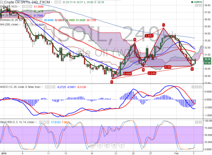 - WTI oil has made a low of $29.38 and started to recover from that level. It is currently trading around $30.32.