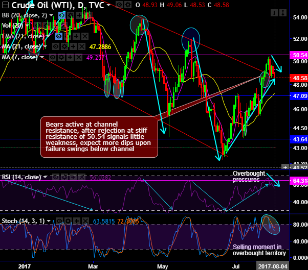 As stated in our previous post, WTI crude price has been drifting through ascending triangle support (on the weekly chart) showing strength in price spikes after testing support at ascending triangle baseline. The current prices on this time frame have gone above 21-EMAs, whereas the bears have plummeted prices below 49.26 levels (i.e. 7DMA).