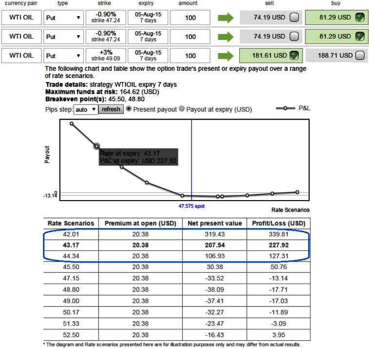 As shown in the diagram, Spot WTI oil is currently trading at $47.66. An options trader who is bearish on this commodity executes 2:1 put back-spread by shorting a near month 7D (3%) In-The-Money put for $181.61 and buying 2 lots of near month same 7D (-0.90%) Out-Of-The-Money -0.42 delta puts for $81.29 each for the net credit of $19.03 to enter the trade.