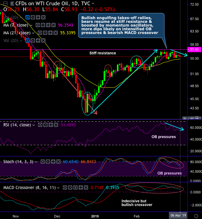 Technical and Candlestick Patterns: WTI crude’s bullish engulfing pattern at $46.57 levels, has taken-off rallies above 21-DMA, but the bears resume at the stiff resistance of $57.93 levels. The selling pressures are boosted by both the momentum oscillators, RSI and stochastic curves show downward convergence to the mild price dips to indicate overbought (OB0 pressures.