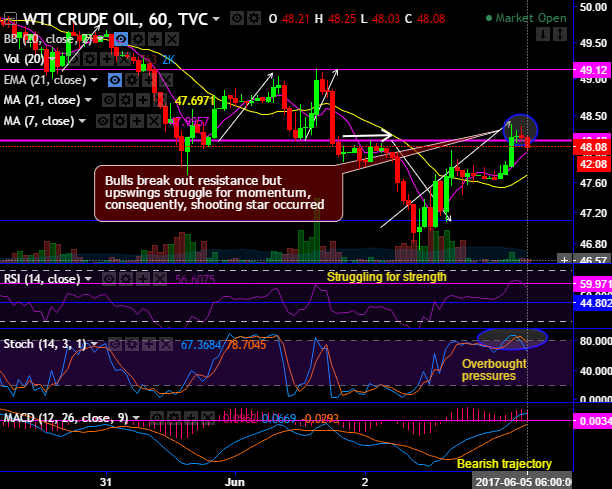 The bull candle with the large real body is traced out at 48.22 levels and as a result, bulls have managed to break out resistance but upswings struggle for momentum, consequently, shooting star has occurred at 48.21 levels.