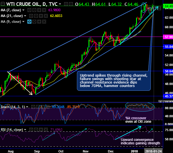 Chart pattern formed - Bulls in minor trend spike through rising channel, failure upswings at channel resistance with gravestone doji formation on daily plotting, hammer pattern occurred at $63.45 levels that counter the bearish pattern.
