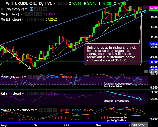 Major supports are observed at $57.18 and $55.77 levels, and bulls have managed to test these major supports before bouncing back.
