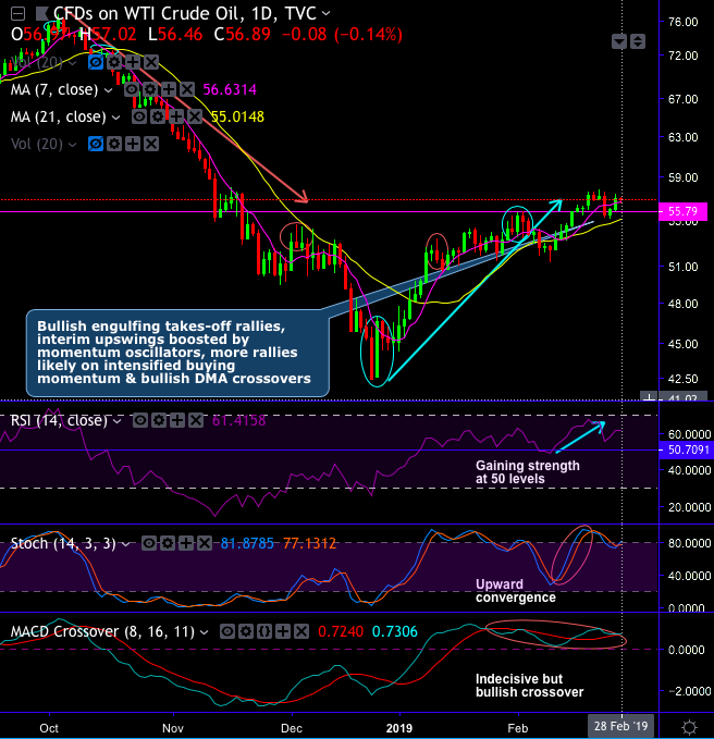 Technical and Candlestick Patterns: WTI crude prices have been spiking higher in the recent past to hit 3-months’ highs ($57.79 levels).
