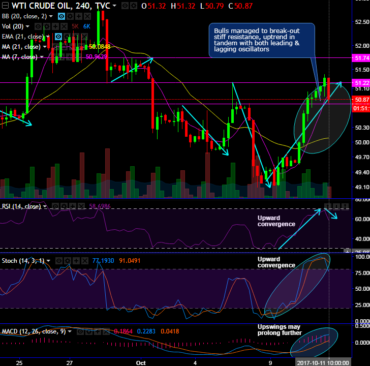 Bulls have managed to break-out stiff resistances of 50.78 and 51.22, the sustenance above the latter would likely drag the rallies, please also be noted that the uptrend in tandem with both leading & lagging oscillators.