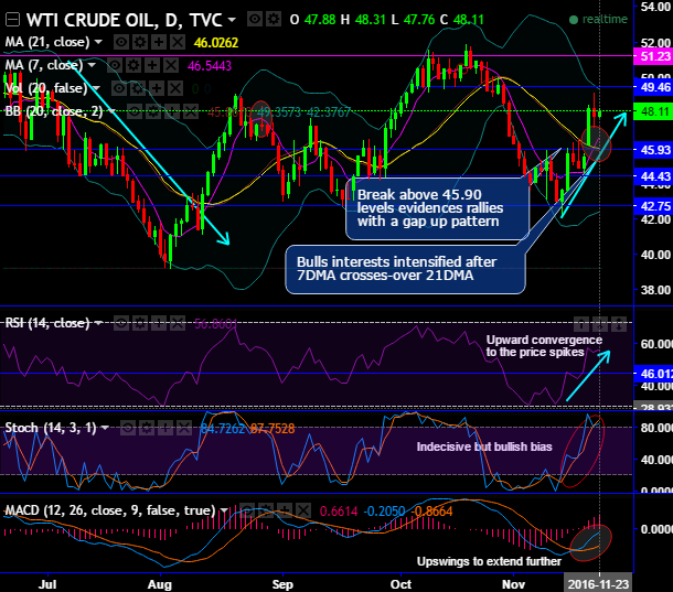We don’t encourage long-term short build ups hereafter; instead, we encourage longs in WTI crude of mid-month expiries for targets of 51.52 levels with strict stop loss of 46.02 levels.