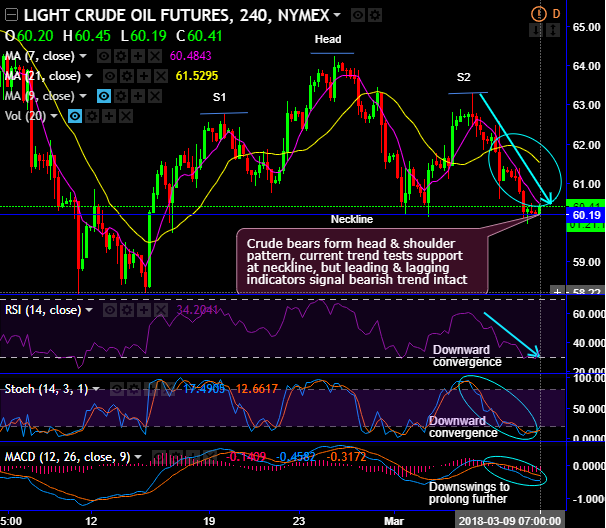 Both leading and lagging indicators (RSI, stochastic curves, moving average and MACD) are in tandem with the downswings completing the bearish pattern (H&S) but the further bearish action is dependent on a breach below 60.19 levels.