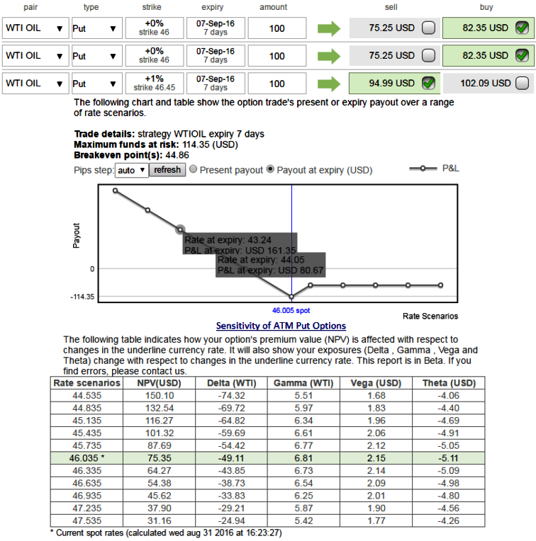 Let’s just suppose hypothetical scenarios contemplating prevailing major downtrend of WTI crude. Calling for 44.75 or below levels, and shorting a 4D (1%) in the money put and go long in 2 lots of the same 1W at the money gamma puts. Thereby, the net debit would be reduced to enter the strategy and any potential downswings would be taken care by 2 lots of puts.