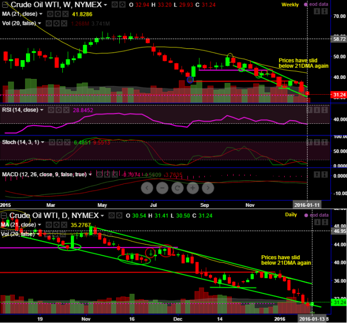 Technical Glimpse: it has found support at lower channel at around 30.50, short term bulls can eye on buying bets contemplating below fundamental reasoning but weekly technicals have still been a sell as RSI beautifully converging downwards with the slumping prices even though it hits oversold zone (currently RSI 14 trending at 24.8452), while %D crossover sustains on slow stochastic even below oversold trajectory, so overall intraday or for even a short term traders can smell buying opportunities for minimal profits but for another month or so we don't see any sort of strength in this commodity that can pull back from current levels.