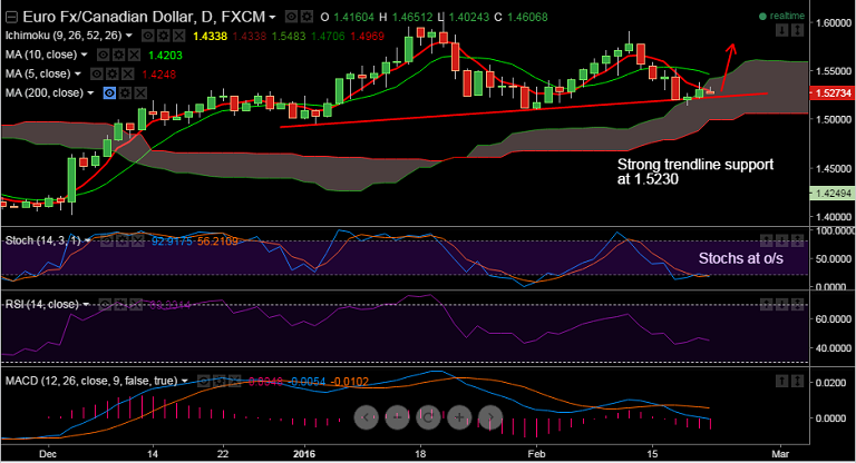 - The pair finds strong support at 1.5230 levels, which is rising trendline, breaks below could see weakness upto 1.5110.