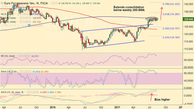 - EUR/JPY is struggling to break above weekly 200-SMA currently at 130.55. We see upside only on decisive close above.